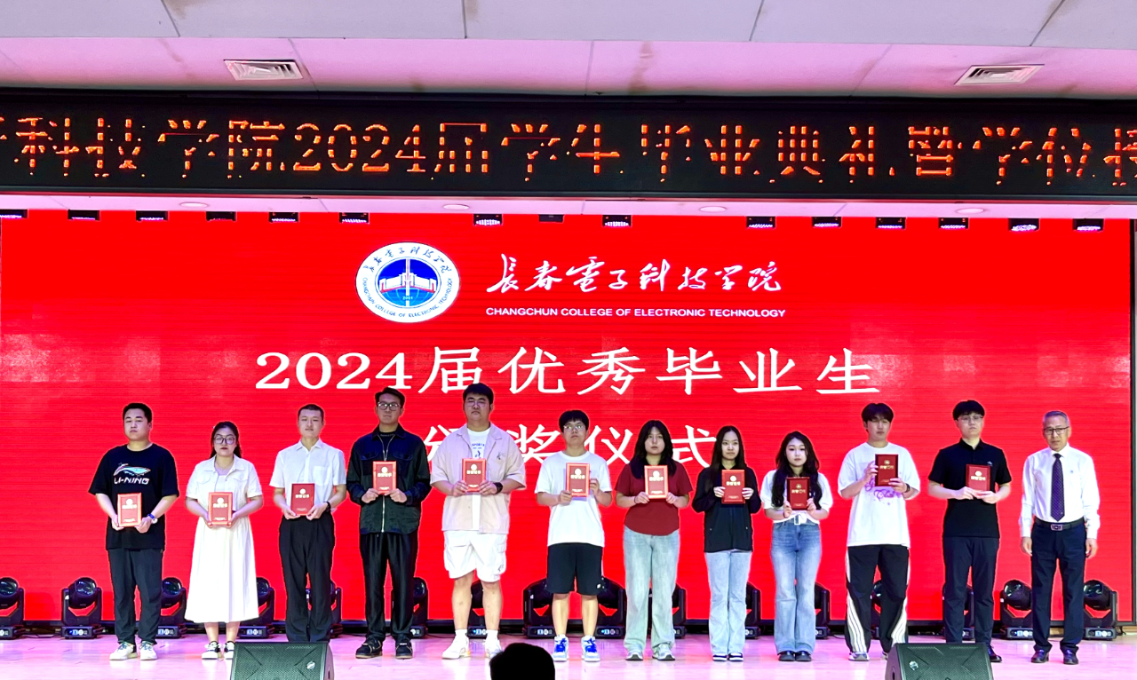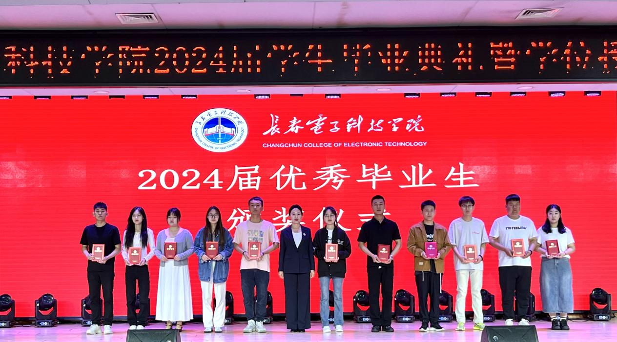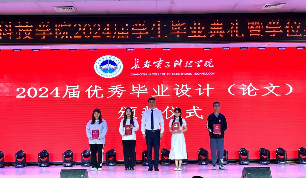 副校长初长洲宣读《关于2024届毕业生校级优秀毕业设计(论文)获奖情况的通报》和《长春电子科技学院关于表彰2024届优秀毕业生的通知》。